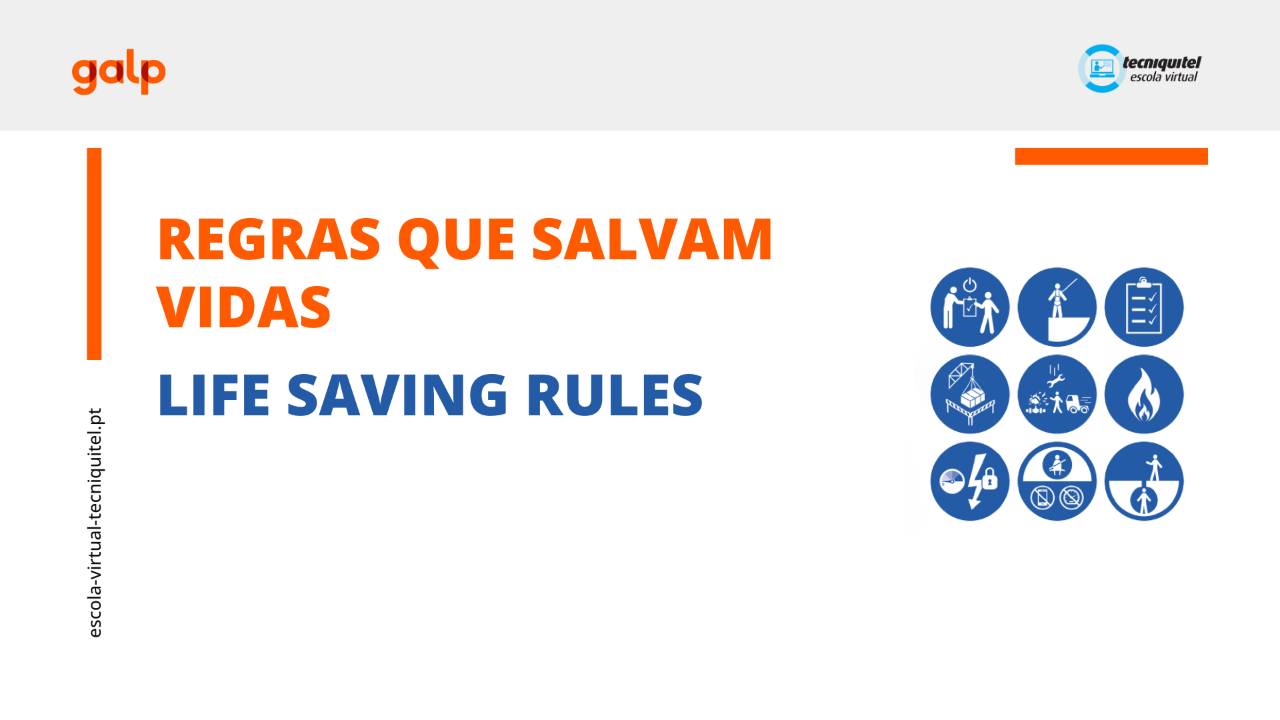 O curso Regras que Salvam Vidas (GALP) apresenta orientações práticas de segurança que visam prevenir acidentes graves e fatais, reforçando comportamentos seguros no trabalho e no dia a dia, alinhados aos padrões de excelência em saúde, segurança e meio ambiente da GALP.