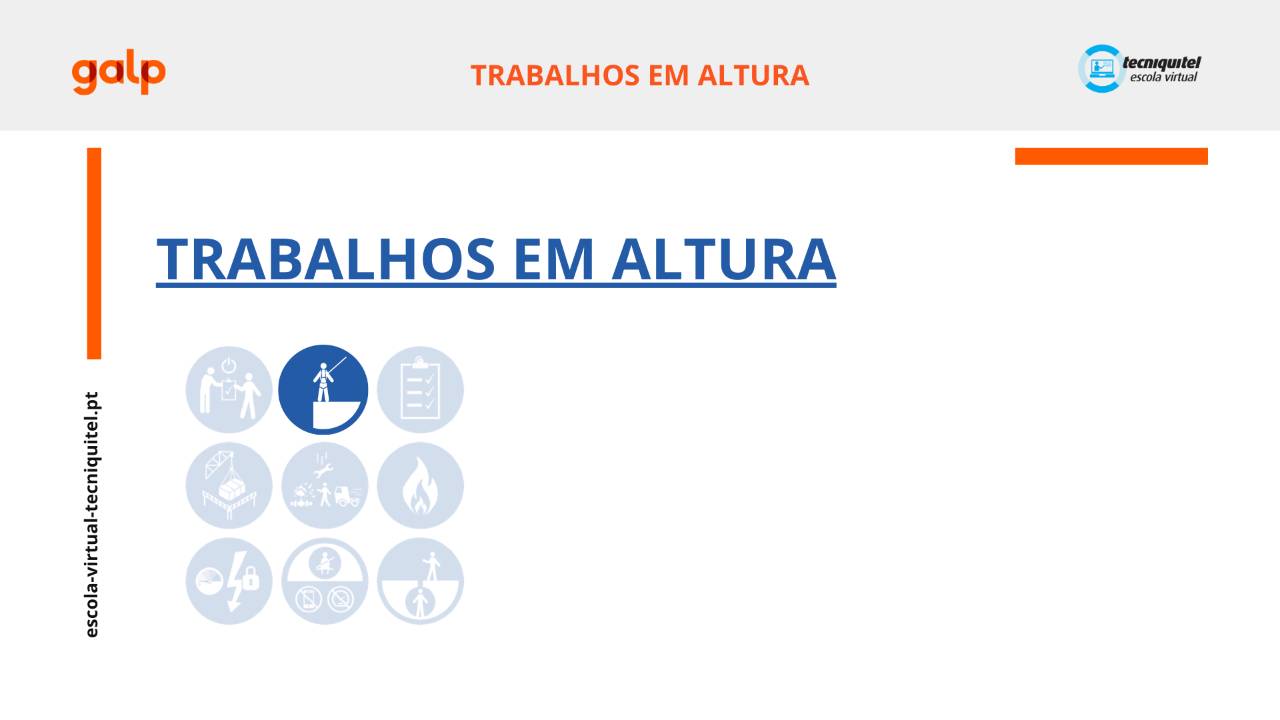 O curso Regras que Salvam Vidas (GALP) apresenta orientações práticas de segurança que visam prevenir acidentes graves e fatais, reforçando comportamentos seguros no trabalho e no dia a dia, alinhados aos padrões de excelência em saúde, segurança e meio ambiente da GALP.